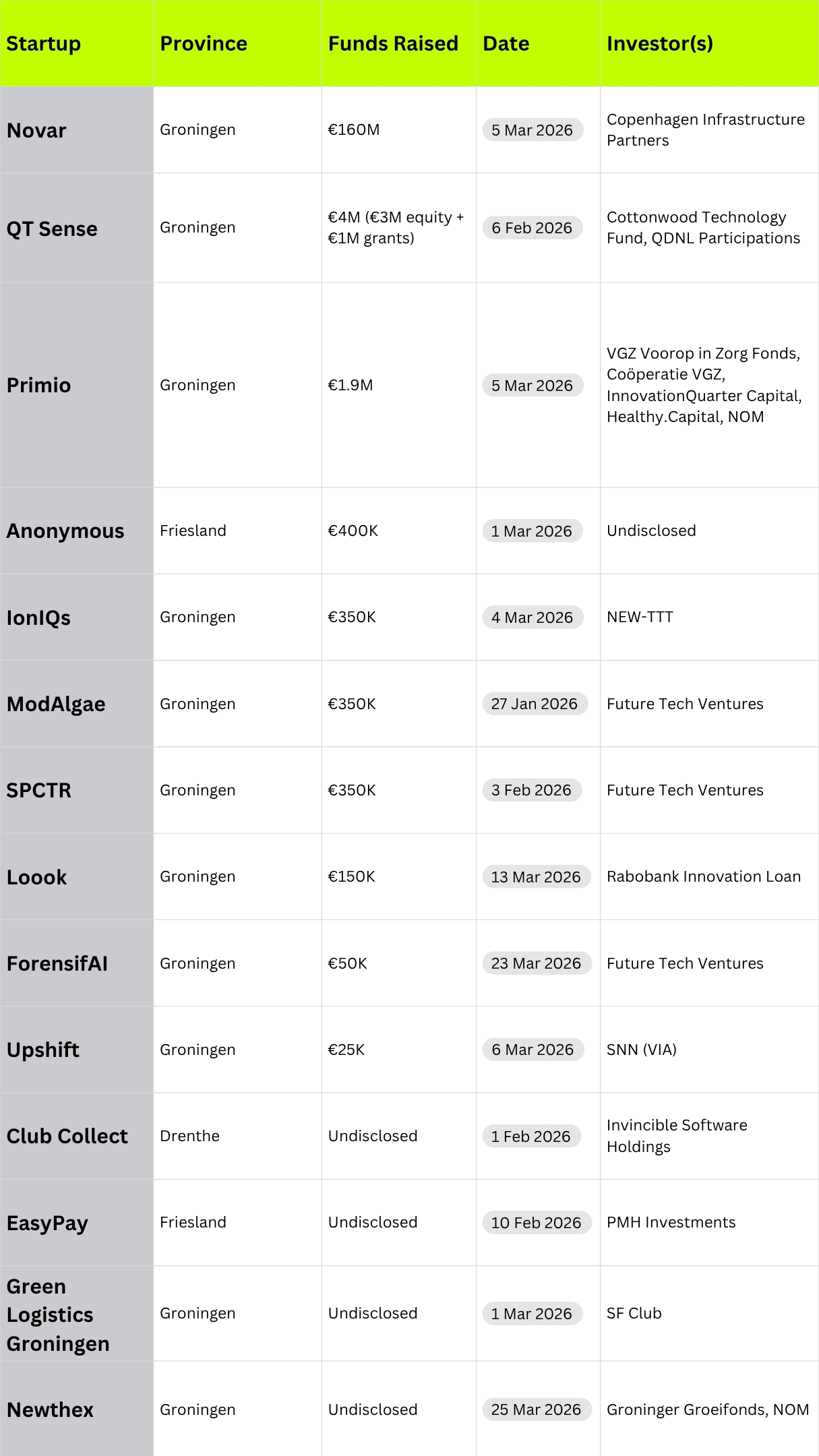 Q1 2026 demonstrates that the Northern Netherlands startup ecosystem is maturing, not just in volume, but in diversity.