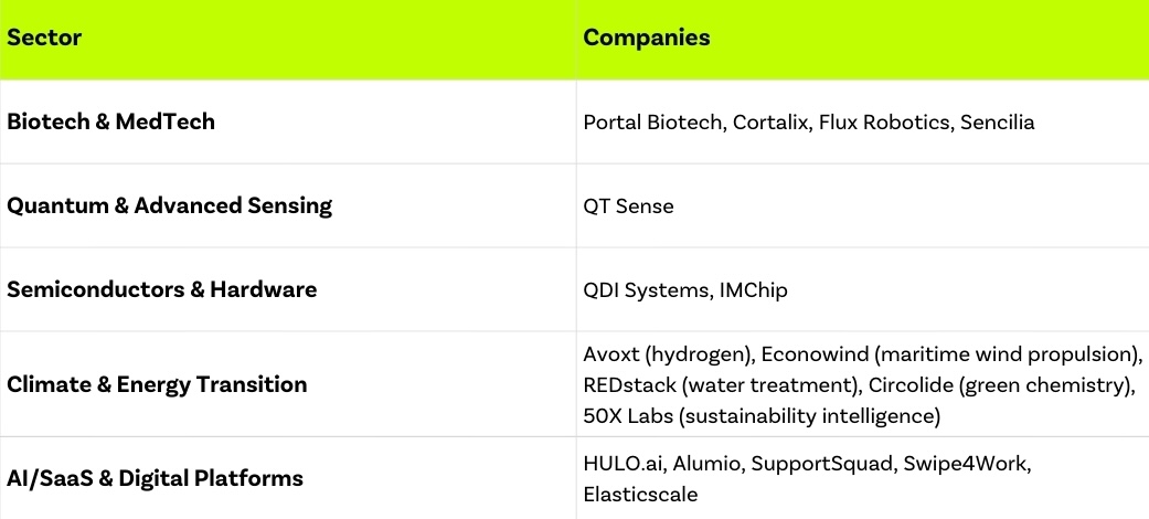 De financieringsactiviteit besloeg een divers deeptech- en impactgericht ecosysteem, zoals weergegeven in de onderstaande tabel.